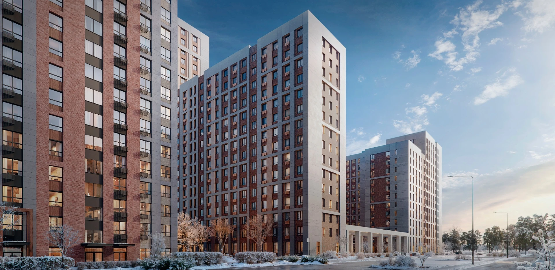 Дома в проекте возводятся по монолитно-кирпичной технологии и имеют переменную этажность – от 9 до 23 этажей. Концепция жилого комплекса основана на сочетании с природой. Отделка фасадов производится с помощью облицовочной плитки и кирпича в естественных оттенках белого и коричневого цветов, для кондиционеров предусмотрены декоративные корзины.