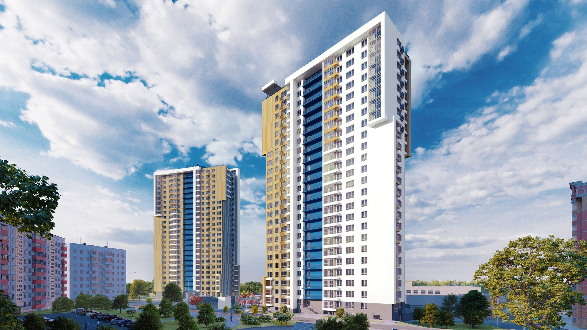 Комплекс выполнен в современном стиле с использованием монолитного каркаса и газосиликатных блоков. Фасады отделаны декоративной штукатуркой в светло-жёлтых, синих и белых тонах, создавая ощущение лёгкости и свежести. Входные группы спроектированы с учётом эргономики и визуальной привлекательности, предусмотрено качественное освещение и декоративные элементы.