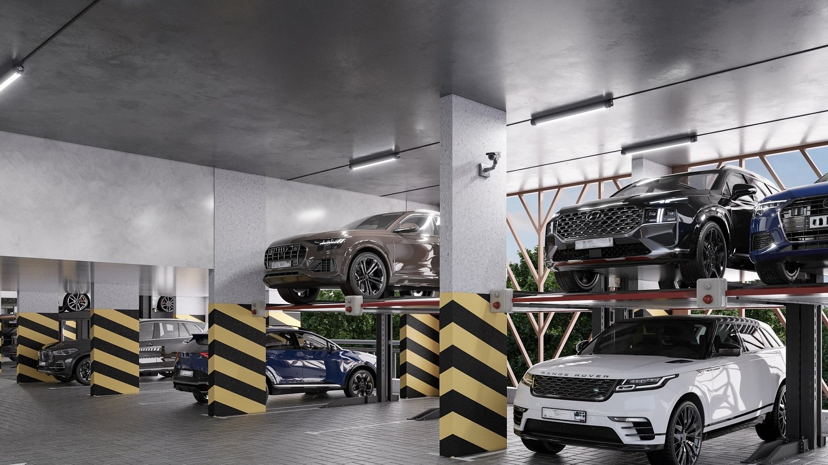 Особое внимание уделено парковочным местам. «Инстеп» одним из первых в Воронеже предлагает двойные парковочные места с механическими подъемниками. С помощью гидравлического механизма автомобиль поднимается на высоту 2,1 м, освобождая место для второго авто. Высота парковочных мест позволяет разместить практически любой легковой автомобиль, включая современные внедорожники.
