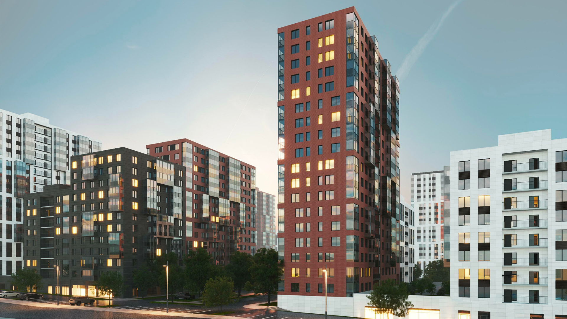 Архитектура выполнена в современном стиле с использованием нейтральной цветовой гаммы и элементов дерева и стекла. Пространства внутри подъездов и общественные зоны оформлены с учётом последних тенденций: натуральные материалы, тактильный комфорт, функциональность.