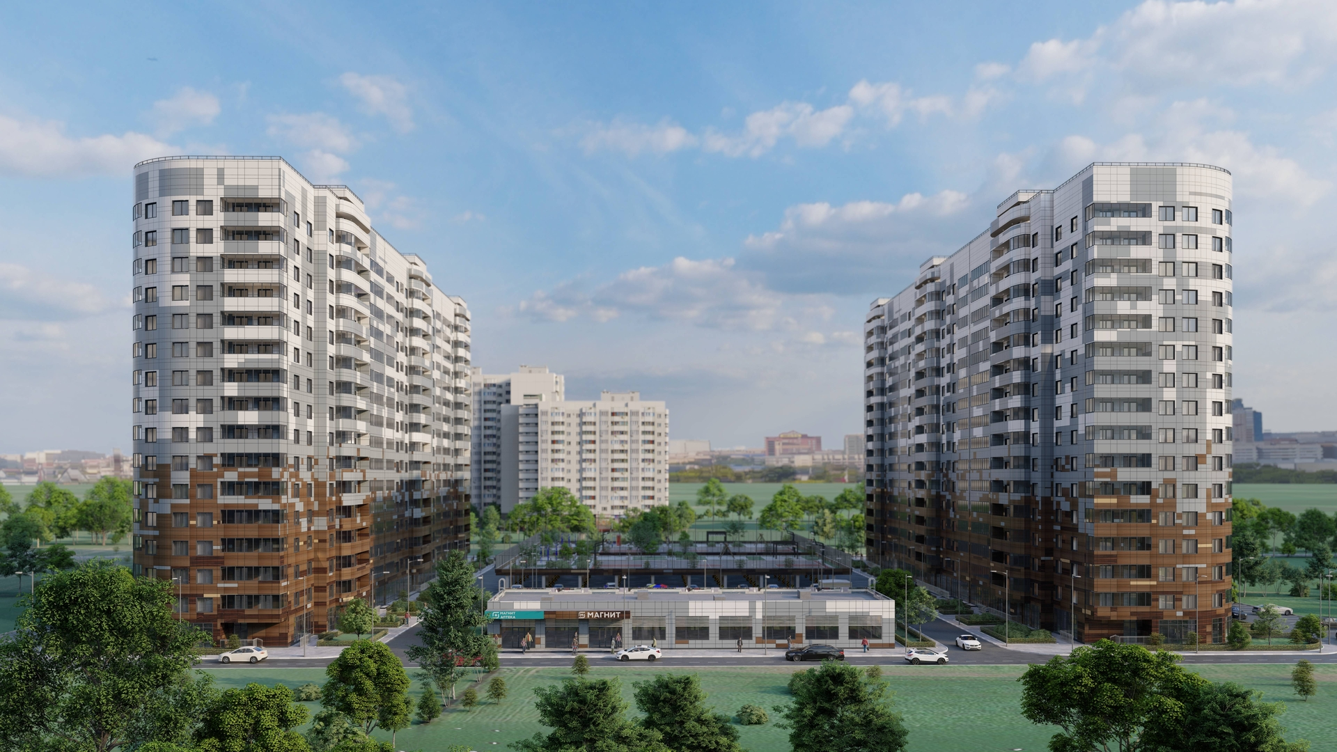 Внутренний двор будет закрытым, что обеспечит дополнительную безопасность и уединение от городской суеты. Внешнее оформление фасадов зданий выполнено с учётом современных архитектурных тенденций, что делает комплекс не только комфортным для проживания, но и эстетически привлекательным.