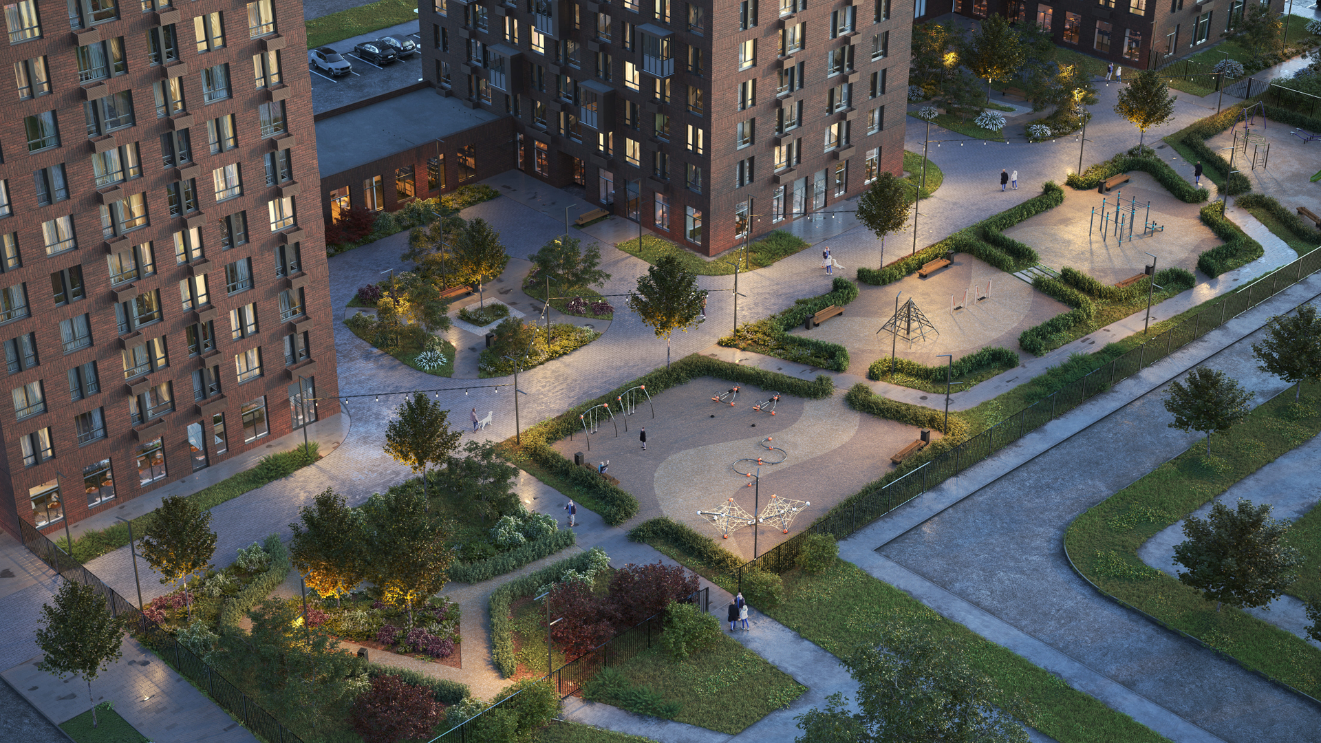 - закрытые дворы-парки «без машин» с детскими и спортивными площадками;