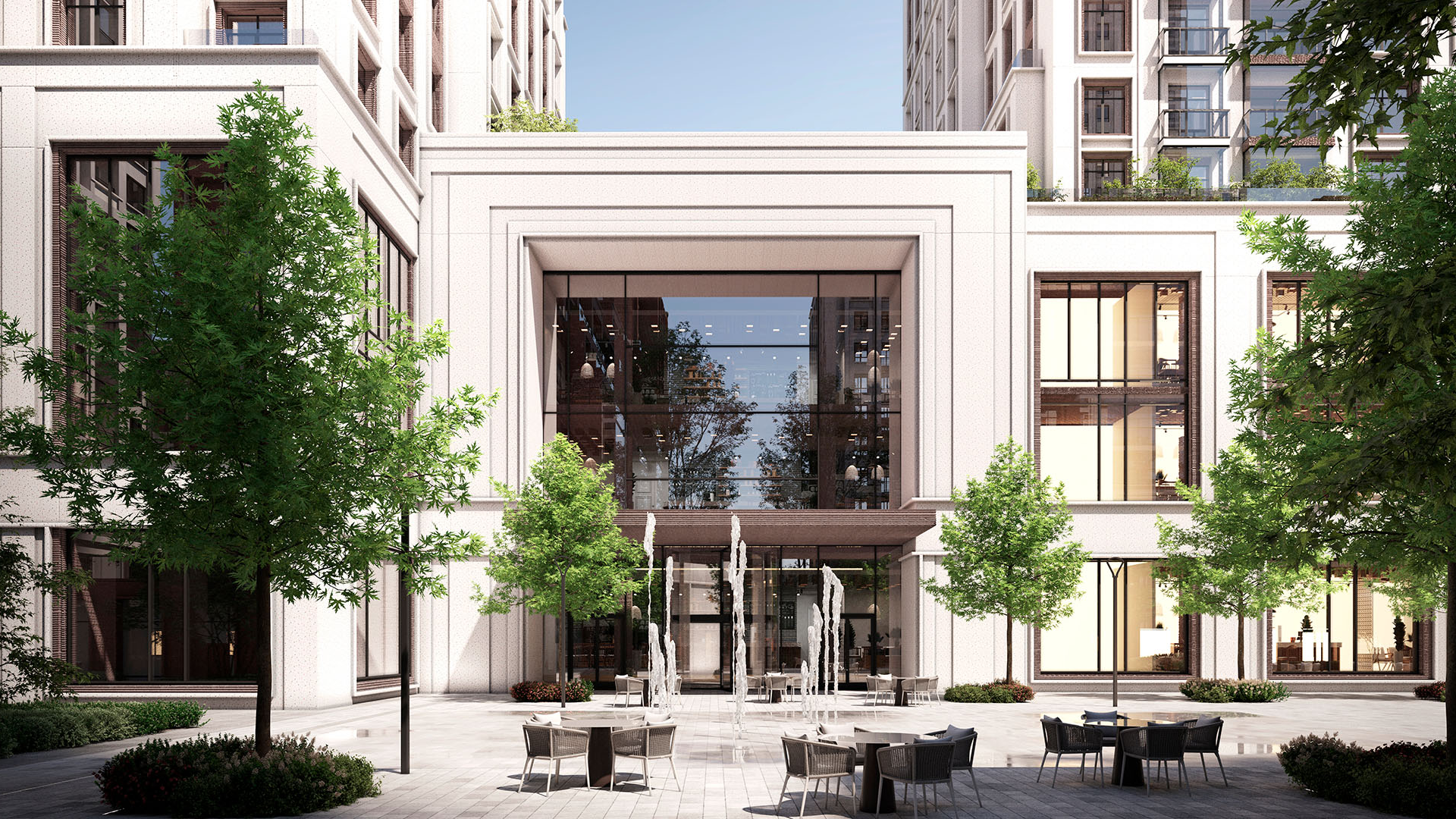 - центральная площадь с фонтаном и сеть общественных пространств с арт-объектами, водоемами и зонами отдыха;