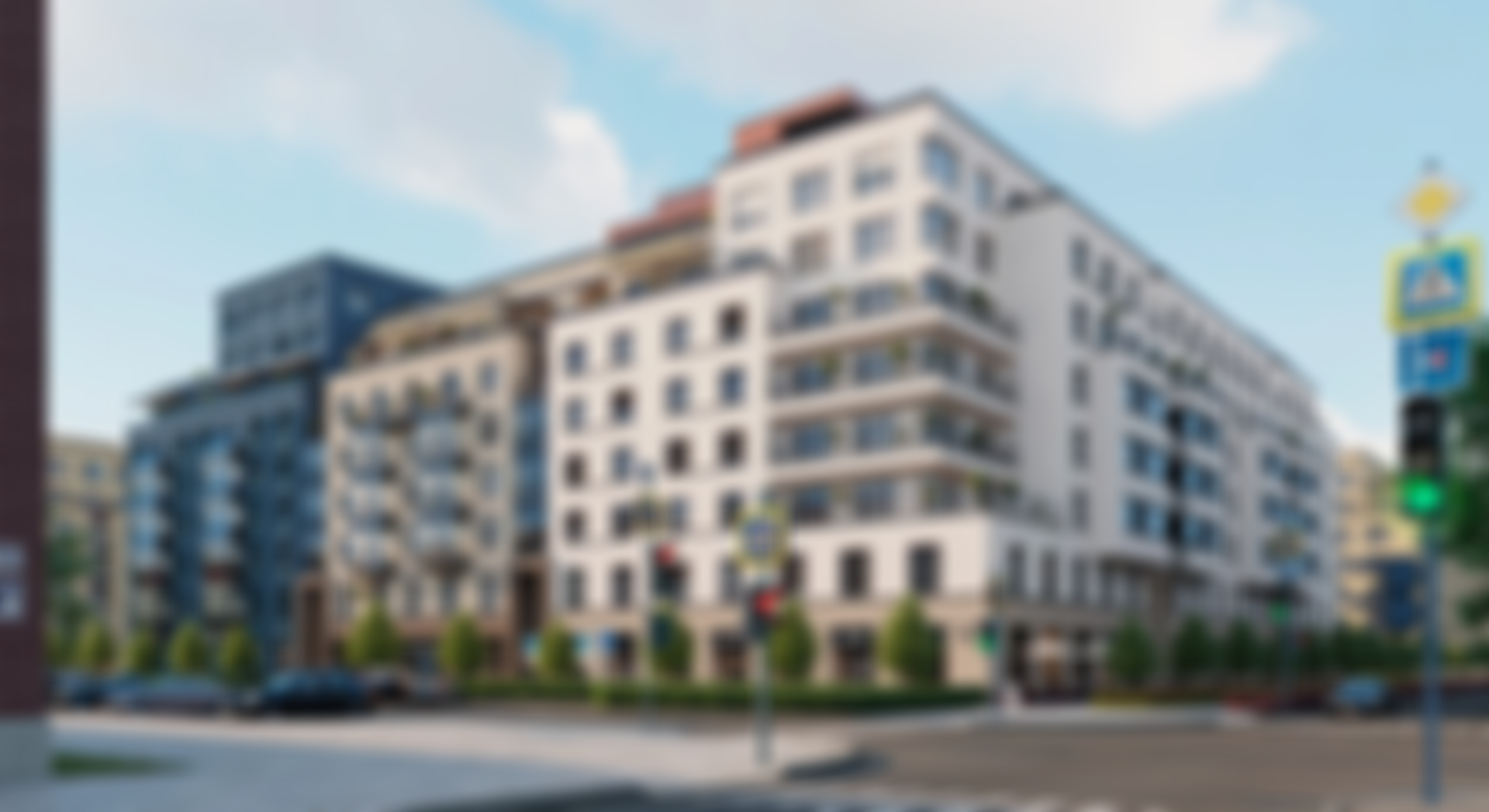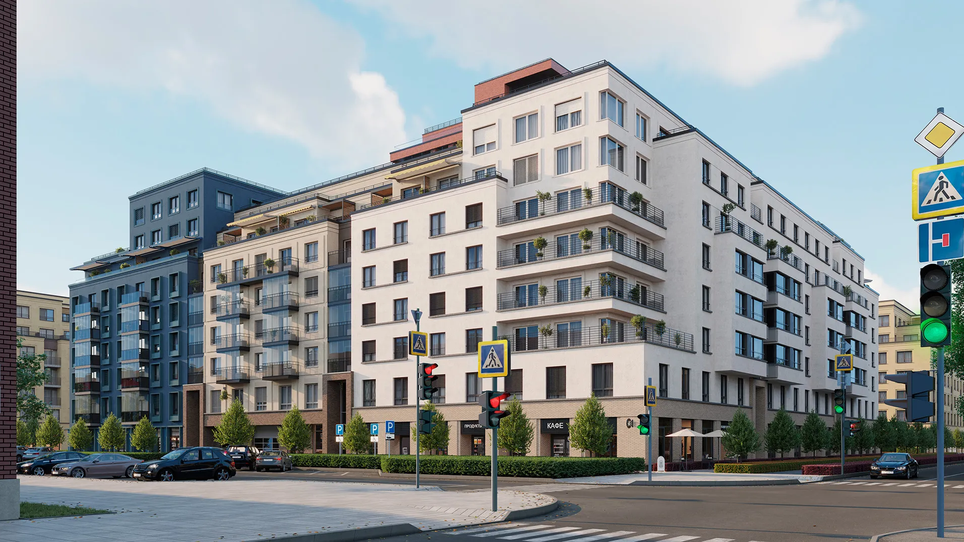 Жилой комплекс состоит из нескольких домов. Дизайн входных групп выполнен в современном стиле, а фасады зданий облицованы качественными материалами. В комплексе запланировано несколько башен и четыре незамкнутых квартала, что обеспечивает разнообразие и интересную архитектуру.