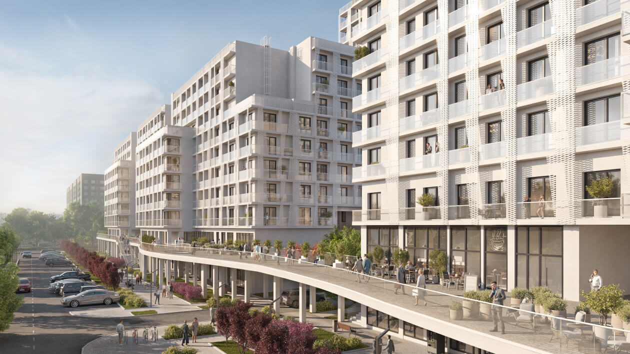 Архитектурный облик комплекса формируют несколько жилых корпусов высотой от 7 до 25 этажей, объединенных пешеходной галереей на втором уровне. Проект разработан известным архитектурным бюро «Остоженка» и уже получил престижную премию Архновация в категории жилых и общественных зданий. Фасады зданий облицованы современными материалами, а дизайн входных групп выполнен в стильном и функциональном ключе.