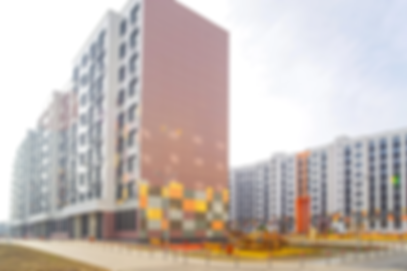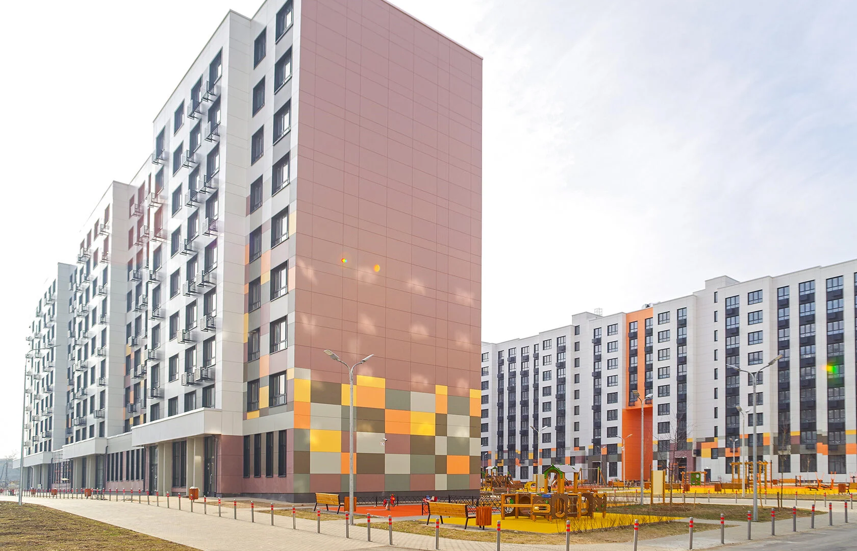 Архитектурный облик комплекса выполнен в лаконичном современном стиле с яркими цветовыми акцентами на балконах и подъездах. Фасады облицованы газосиликатными блоками с утеплителем и навесными фасадами, что обеспечивает теплоизоляцию и эстетичный внешний вид. В проекте задействованы ведущие архитекторы из России и зарубежья, что гарантирует высокое качество и оригинальность дизайна.
