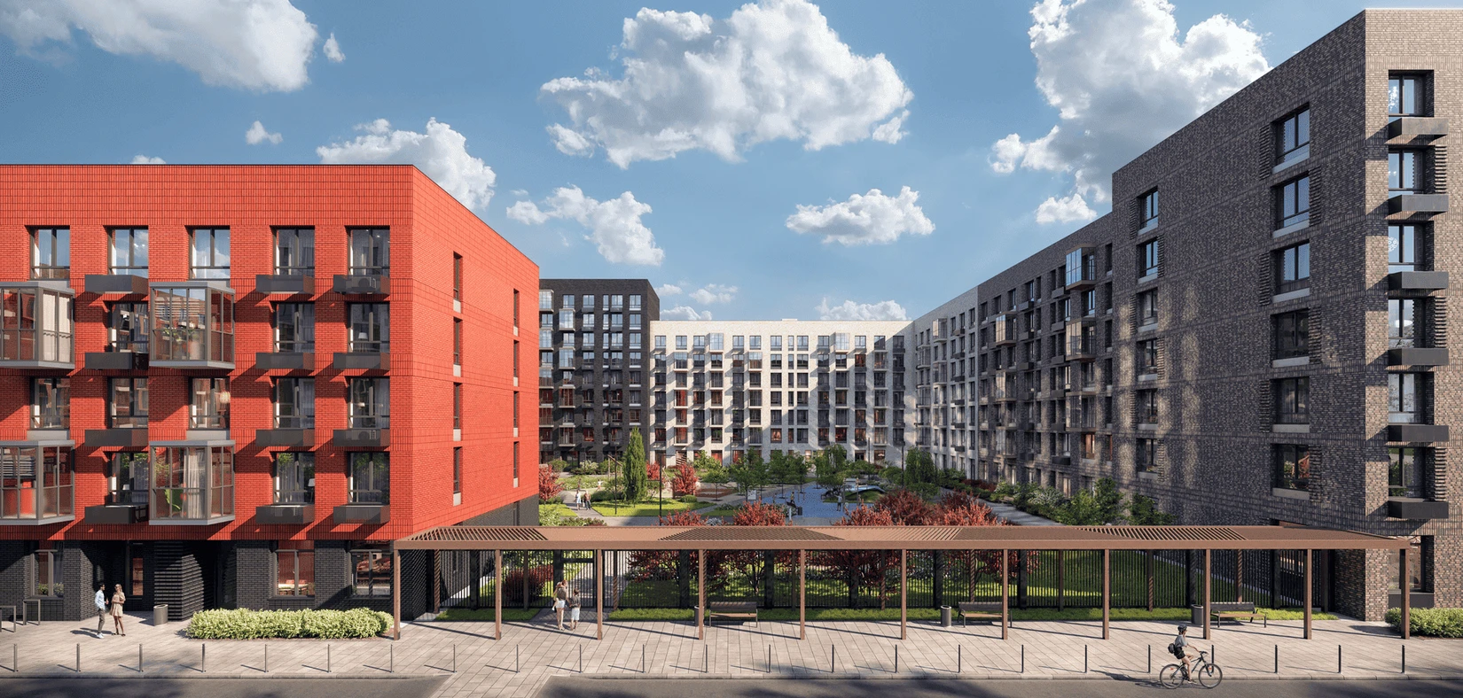 - благоустроенные дворы «без машин» с детскими и спортивными площадками, зонами для отдыха, велодорожками, прогулочным бульваром и набережной;