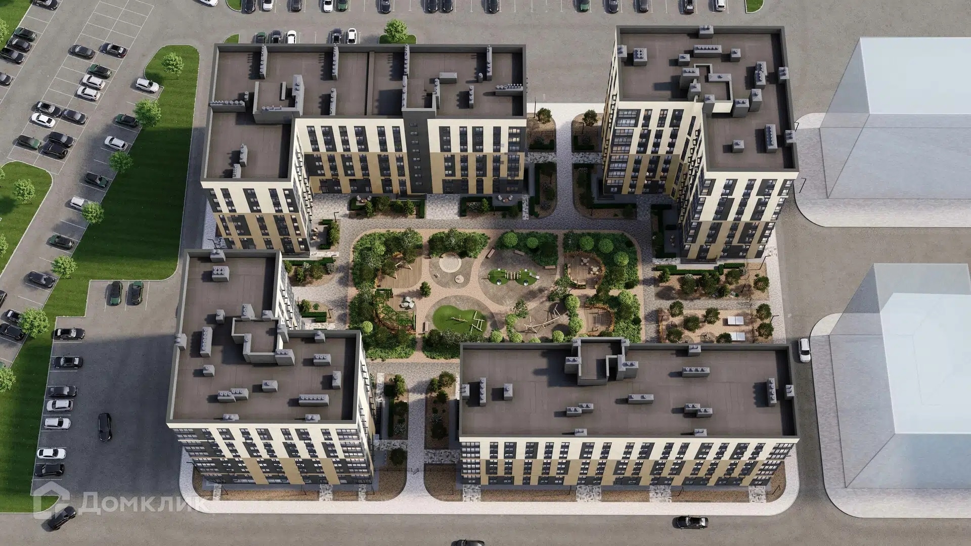 -Концепция «Город в городе»: огороженная придомовая территория с наземным паркингом, различные магазины и кафе на первых этажах.