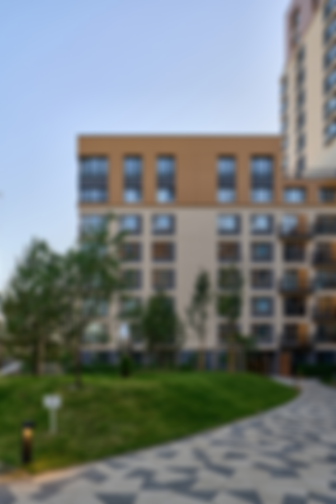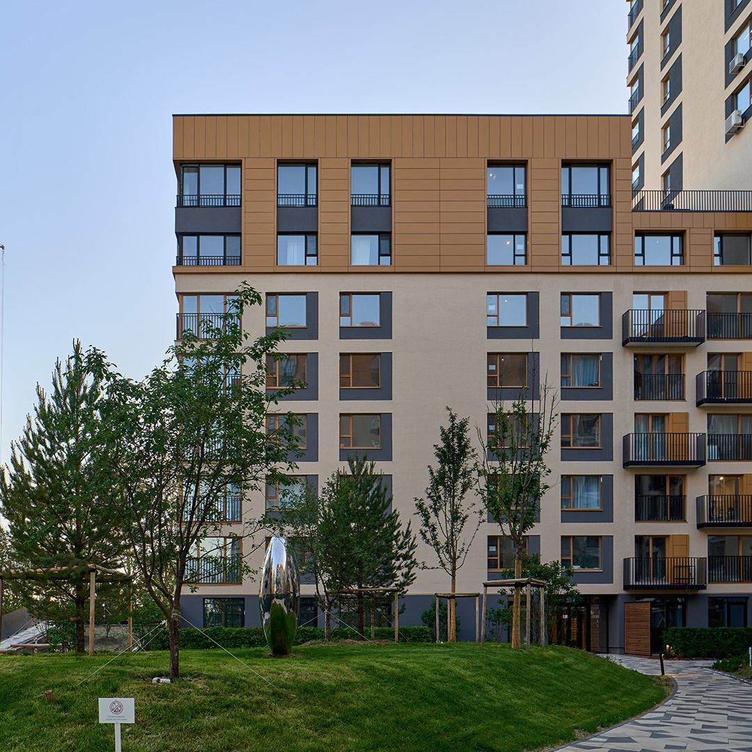 Монолитные дома образуют замкнутые дворы и имеют переменную этажность – от 8 до 17 этажей. В основе архитектурной идеи проекта - близость к природе. Фасады отделаны штукатуркой в тёплых естественных оттенках. Отделка стен верхних этажей выполнена с использованием панелей под дерево, что создает атмосферу загородной застройки. На первых этажах предусмотрена «подрезка», формирующая навесы над входами в здания и витринами ритейла. Интерьеры подъездов повторяют стилистику экстерьеров проекта – они также выполнены в теплой цветовой гамме с применением натуральных материалов. Во входных группах организованы зоны ожидания с мягкой мебелью, картинами и зеркалами.