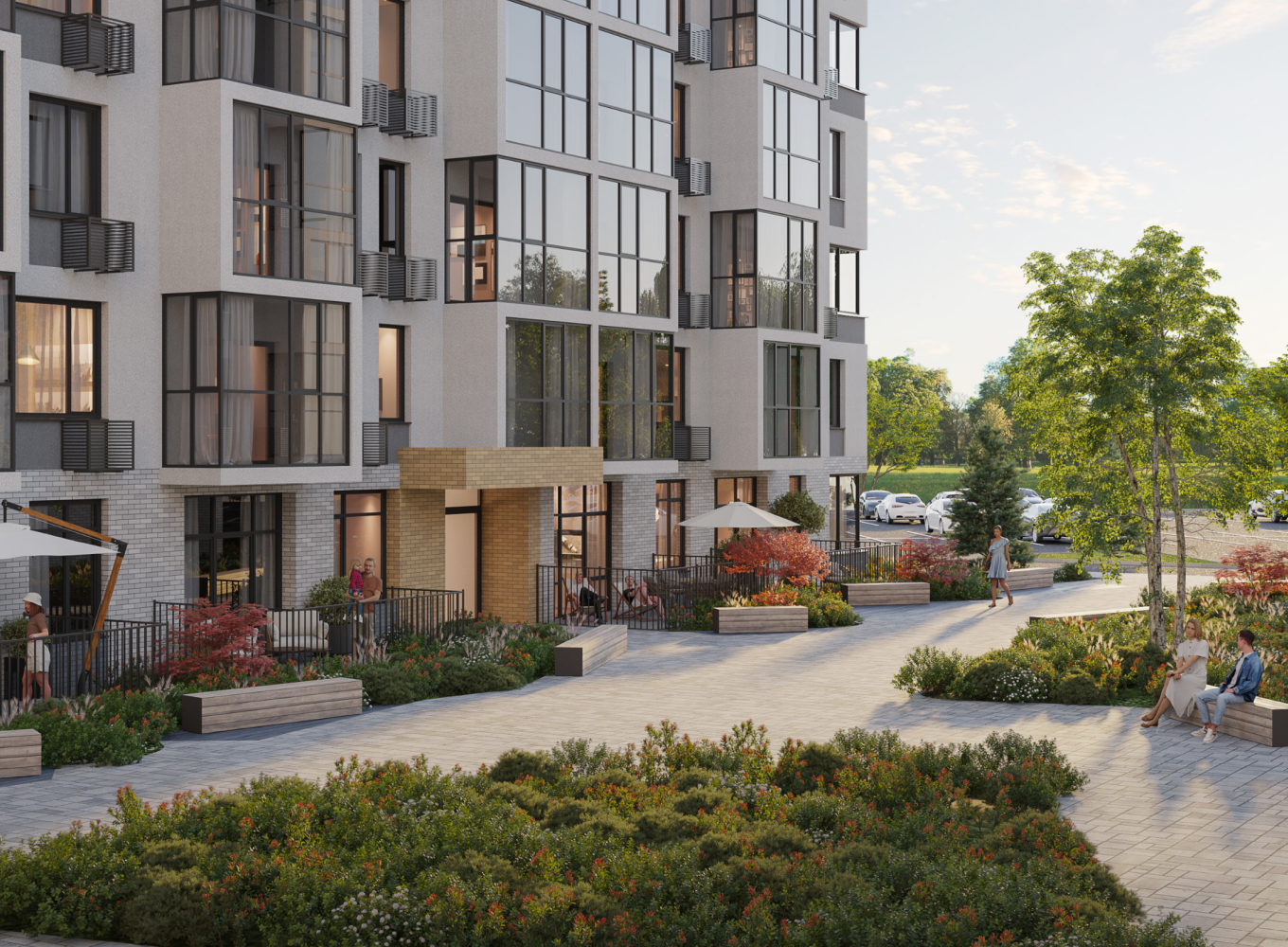 Дизайн комплекса отличается современной асимметричной архитектурой с облицовкой в серых и бежевых тонах. Здания имеют переменную этажность, что создает ощущение простора и свободы. Входные группы выполнены в элегантном стиле, а фасады зданий гармонично вписываются в окружающую среду.