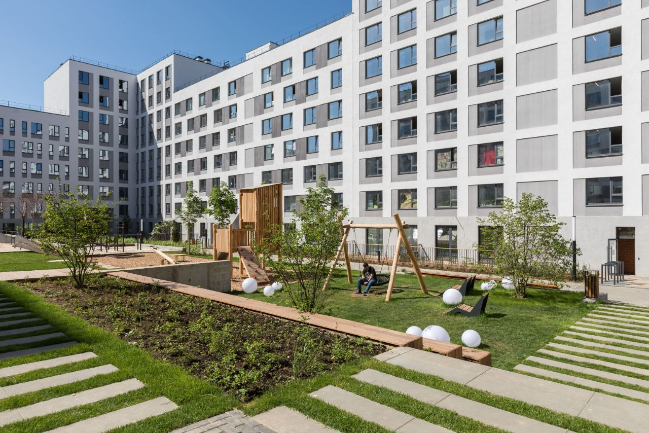 На территории жилого комплекса для автомобилей будут построены два многоуровневых паркинга. На первых этажах проектом предусмотрены коммерческие помещения, а также квартиры с террасами и отдельными входами. Для 265 детей предусмотрен детский сад, для 1700 учеников - школа. При оформлении придомовой территории использованы элементы ландшафтного дизайна.