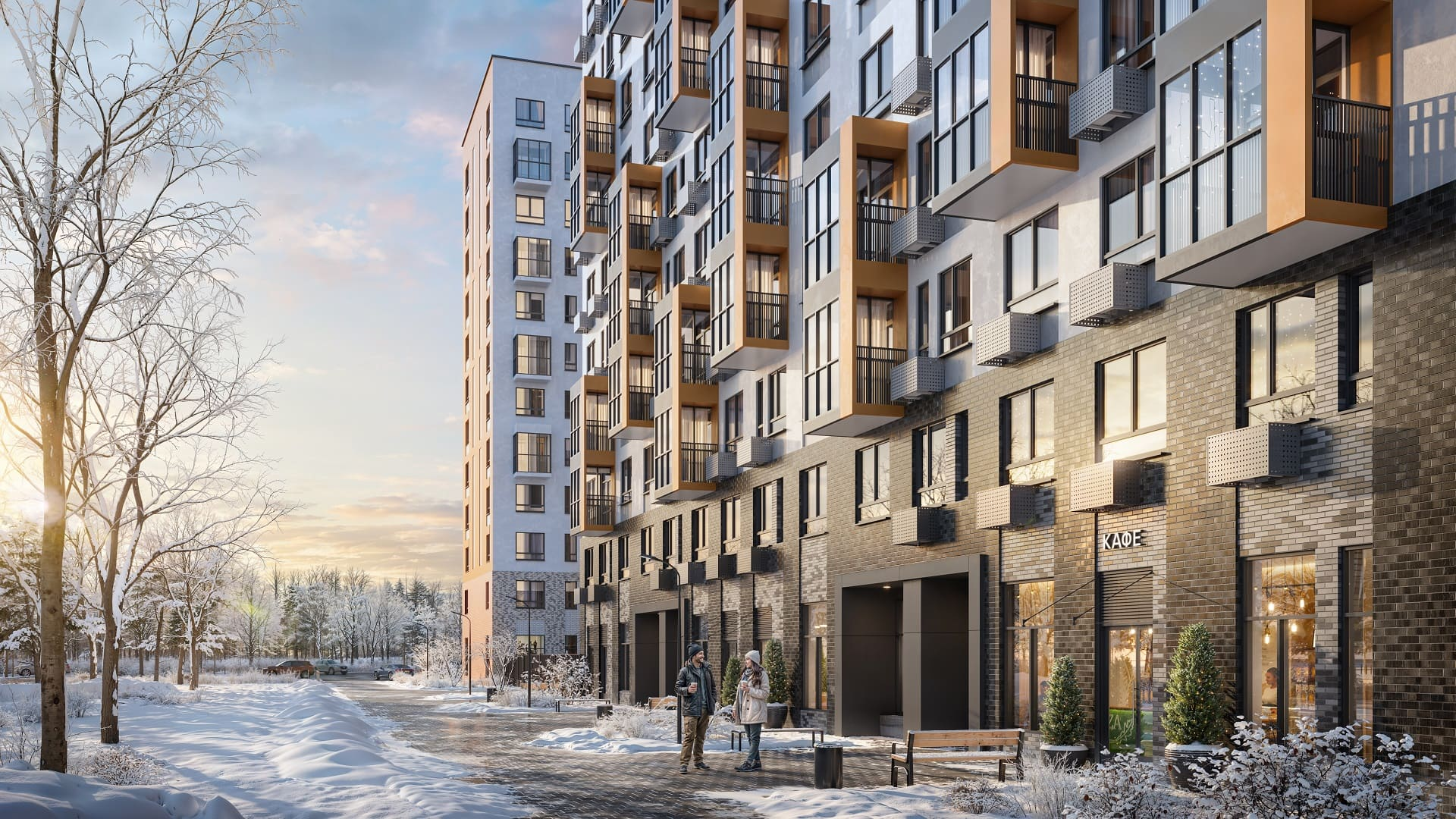 Дома строятся по технологии монолитного строительства и будут иметь высоту 11 и 12 этажей. Внешнюю отделку выполнят с помощью материалов теплых природных оттенков. Фасады, смотрящие на центральный бульвар, будут радикально отличаться от основной застройки - их выполнят в винном цвете, чтобы создать яркий и образ общественного пространства. Входные группы в природных материалах натуральных оттенков будут иметь сквозной вход и панорамное остекление.