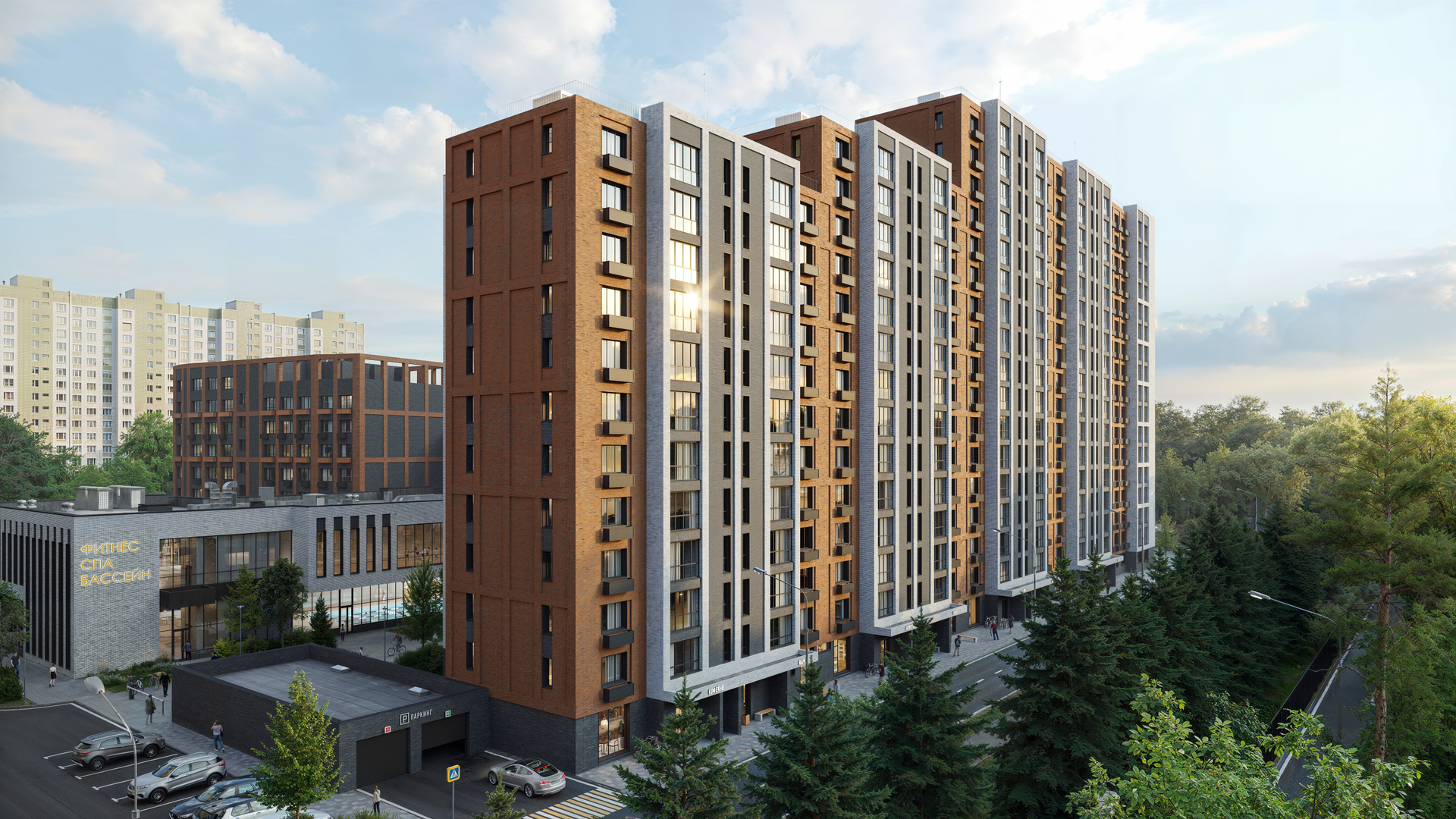 Проект представляет собой 7 кирпично-монолитных корпусов переменной этажности высотой от 6 до 17 этажей. Запроектированы студии с площадью от 26 кв.м, однокомнатные квартиры с площадью от 34 кв.м, двухкомнатные квартиры с площадью от 55 кв.м, трехкомнатные квартиры с площадью от 71 кв.м. Всего 1094 квартиры с высокими потолками до 3 м и панорамным остеклением. В квартирах эргономичные и функциональные планировки, проектом предусмотрены квартиры со свободными планировками с возможностью реализовать самые смелые дизайнерские решения. Жильё сдаётся без отделки, с чистовой отделкой и отделкой white box на выбор. Благодаря применению современных технологий в строительстве в жилом комплексе повышенная гидро-, шумо- и теплоизоляция. Архитектурная концепция жилого комплекса выполнена в стиле «минимализм» с использованием ярких цветовых акцентов на фасадах. В жилом комплексе реализуется концепция «двор без машин». 700 автомобилей можно разместить на отапливаемом подземном паркинге. На территории комплекса предусмотрен гостевой паркинг. В кладовых помещениях можно хранить спортивное снаряжение, сезонное оборудование и инвентарь, велосипеды, коляски, мебель, домашние заготовки, инструменты, зимнюю резину и автомобильные кресла. На первых этажах находятся коммерческие помещения, кофейни с ароматным кофе и выпечкой, магазины продуктов. В просторных и светлых входных группах выполнен дизайнерский ремонт, установлена навигация для удобного перемещения, работают скоростные и бесшумные лифты. Во внутреннем дворе в клумбах растут яркие цветы, высажены многолетние деревья и кустарники, аромат хвойных деревьев наполняет ароматом воздух внутреннего двора. В жилом комплексе находится собственный детский сад для малышей и спортивно-оздоровительный комплекс. В спорткомплексе есть несколько видов бани и сауна, бассейн с несколькими степенями очистки воды, тренажёрный зал и площадки для занятий на воздухе, массажный кабинет. На детских площадках установлены игровые городки, песочницы с игрушками, качели. Для активных ценителей спорта на территории комплекса есть беговые дорожки с антиударным покрытием, площадки для групповых видов спорта и тренажёры. В зонах отдыха предусмотрены лужайки для пикников, установлены скамьи и фонари. Для обеспечения безопасности на территории жилого комплекса ведётся круглосуточное видеонаблюдение, установлены контроль доступа и видеодомофоны, доступ для посторонних ограничен, а въезд на территорию комплекса возможен только при предъявлении пропуска.