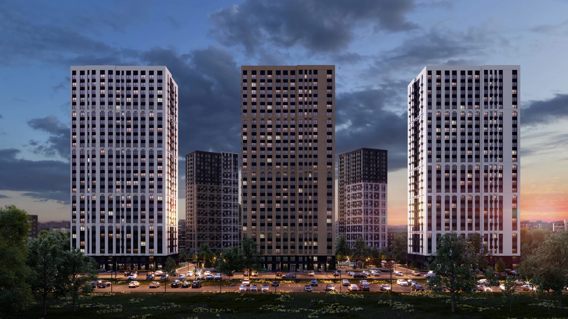 Комплекс состоит из трех 26-этажных домов, выполненных в современном стиле. Архитектура комплекса включает технологию «мокрый фасад», которая не только подчеркивает геометрию зданий, но и обеспечивает надежное утепление. Входные группы оформлены стильно и функционально, что создает приятное впечатление от первого шага в дом.