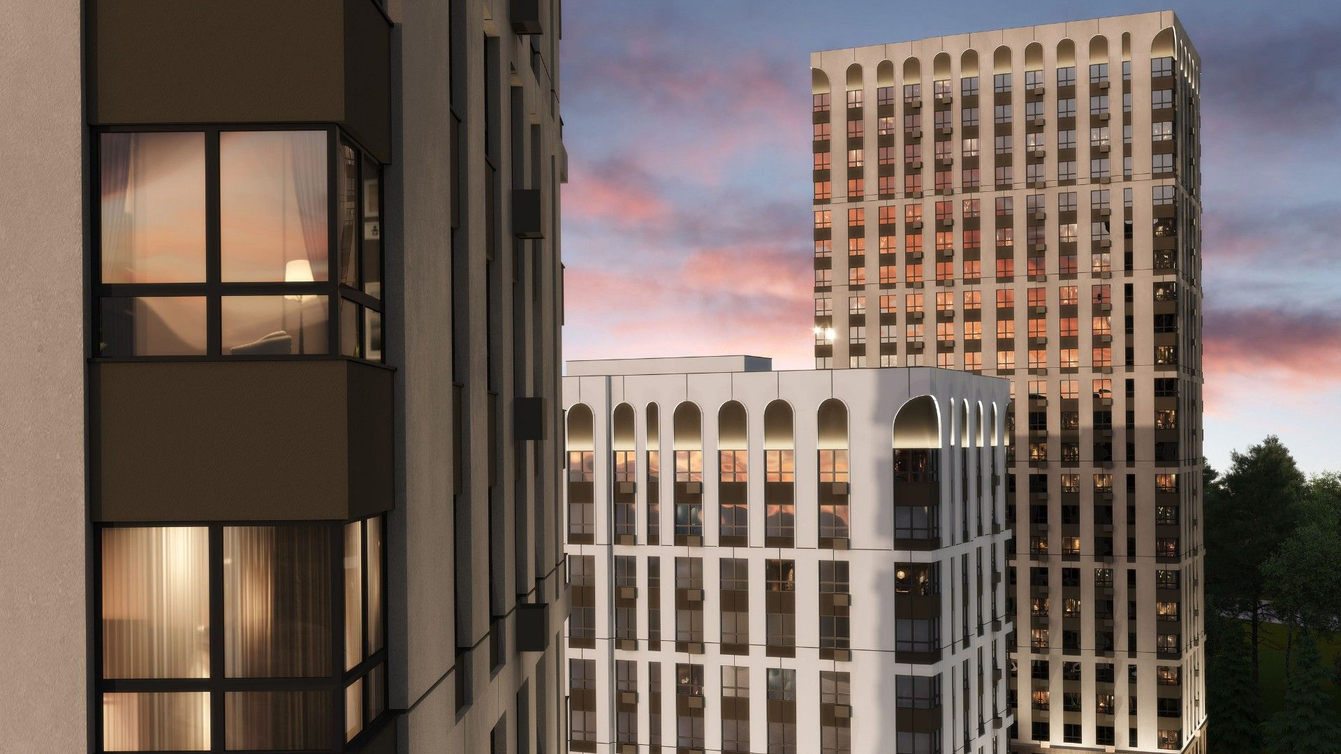 Дизайн жилого комплекса сочетает сдержанную классику и современные архитектурные решения. Входные группы оформлены в едином стиле, фасады облицованы качественными материалами, что придает комплексу респектабельный и аккуратный внешний вид. Особое внимание уделено остеклению: угловые панорамные окна обеспечивают максимум естественного света и создают ощущение простора в квартирах.