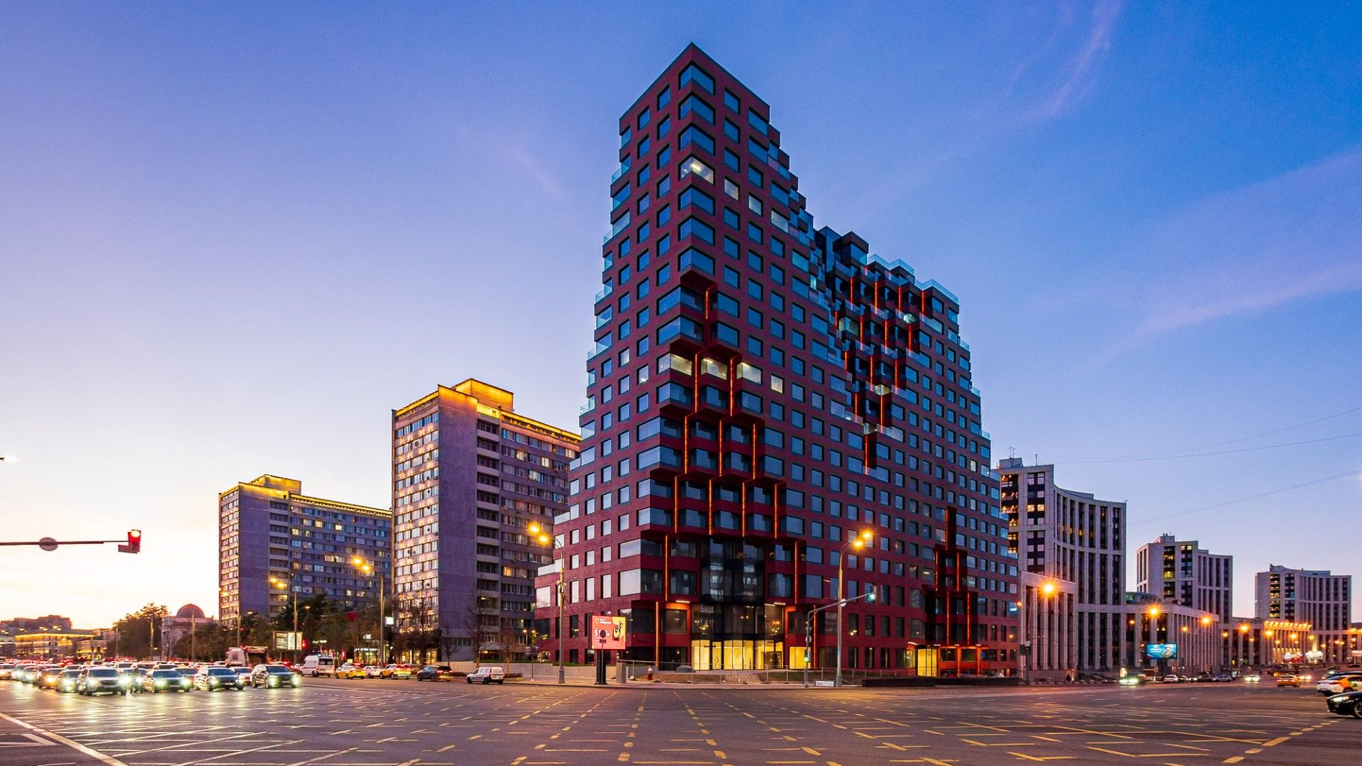 Для создания комплекса пригласили специалистов из Нидерландов. Фасад здания ярко-красного цвета многогранной формы выполнен в стиле «Русский авангард». Основное назначение комплекса — пентхаусы, оснащенные террасами, однокомнатные, двухкомнатные, трехкомнатные квартиры и апартаменты, общая площадь составляет более 38000 кв м.