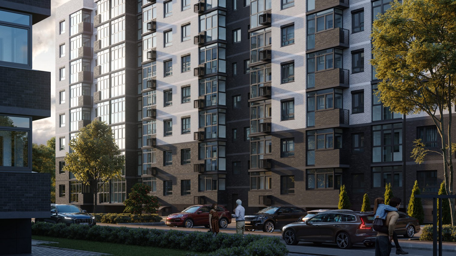 Комплекс состоит из трех восьмиэтажных домов, образующих полузамкнутый двор. Его форма обеспечивает комфортную атмосферу в дворе и максимальную приватность для жильцов. В отделке фасадов использованы высококачественные облицовочные материалы, включая керамический и силикатный кирпич двух цветов: графит и белый.