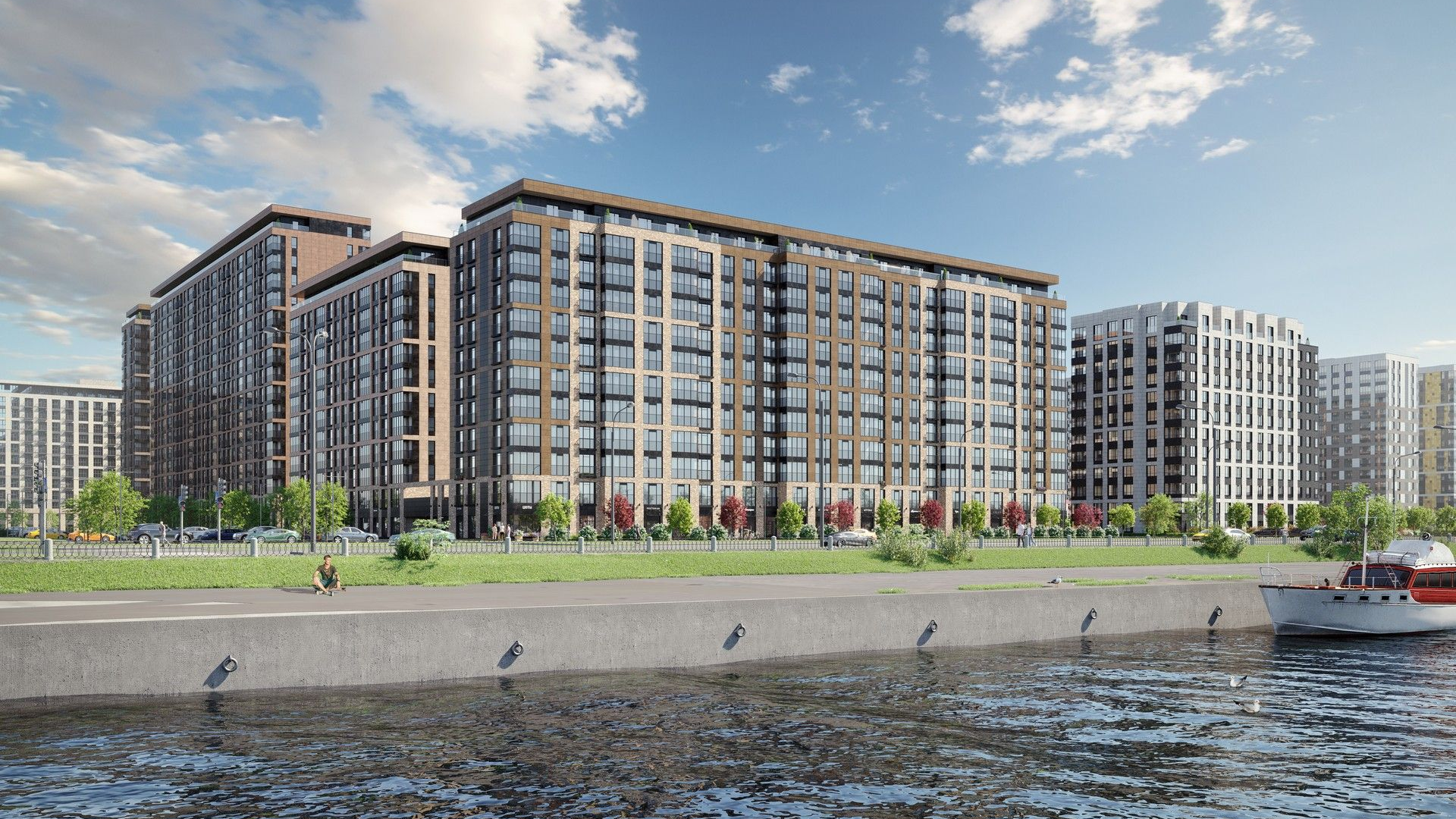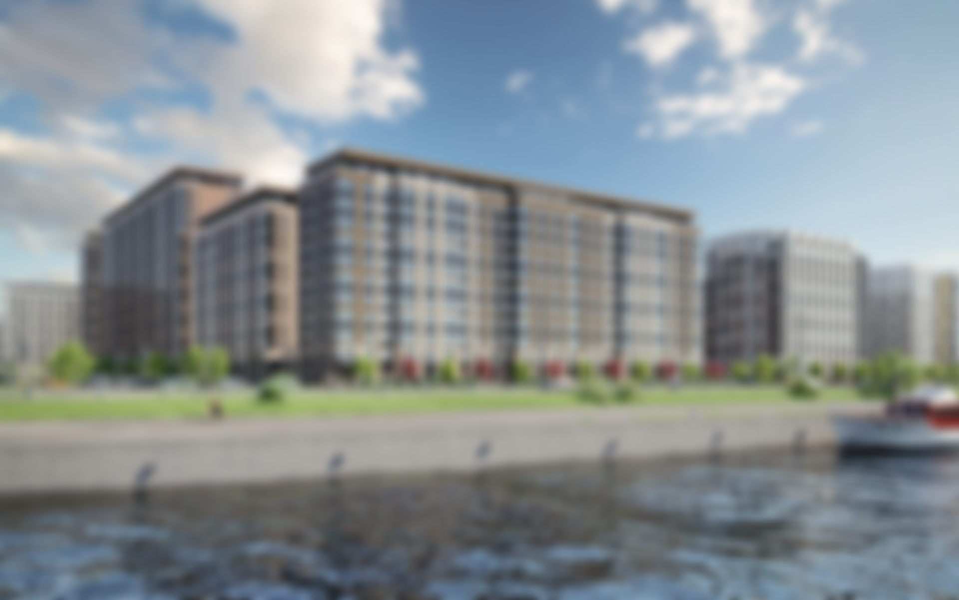 Архитектурный облик комплекса представлен двумя очередями с домами высотой от 12 до 17 этажей. Фасады облицованы керамогранитом и материалами под кирпич, дополнены французскими балконами и панорамным остеклением. Вечерняя подсветка зданий создает уютную и выразительную атмосферу на Октябрьской набережной. Входные группы оформлены в едином двухуровневом стиле, подчеркивающем современный и элегантный дизайн.