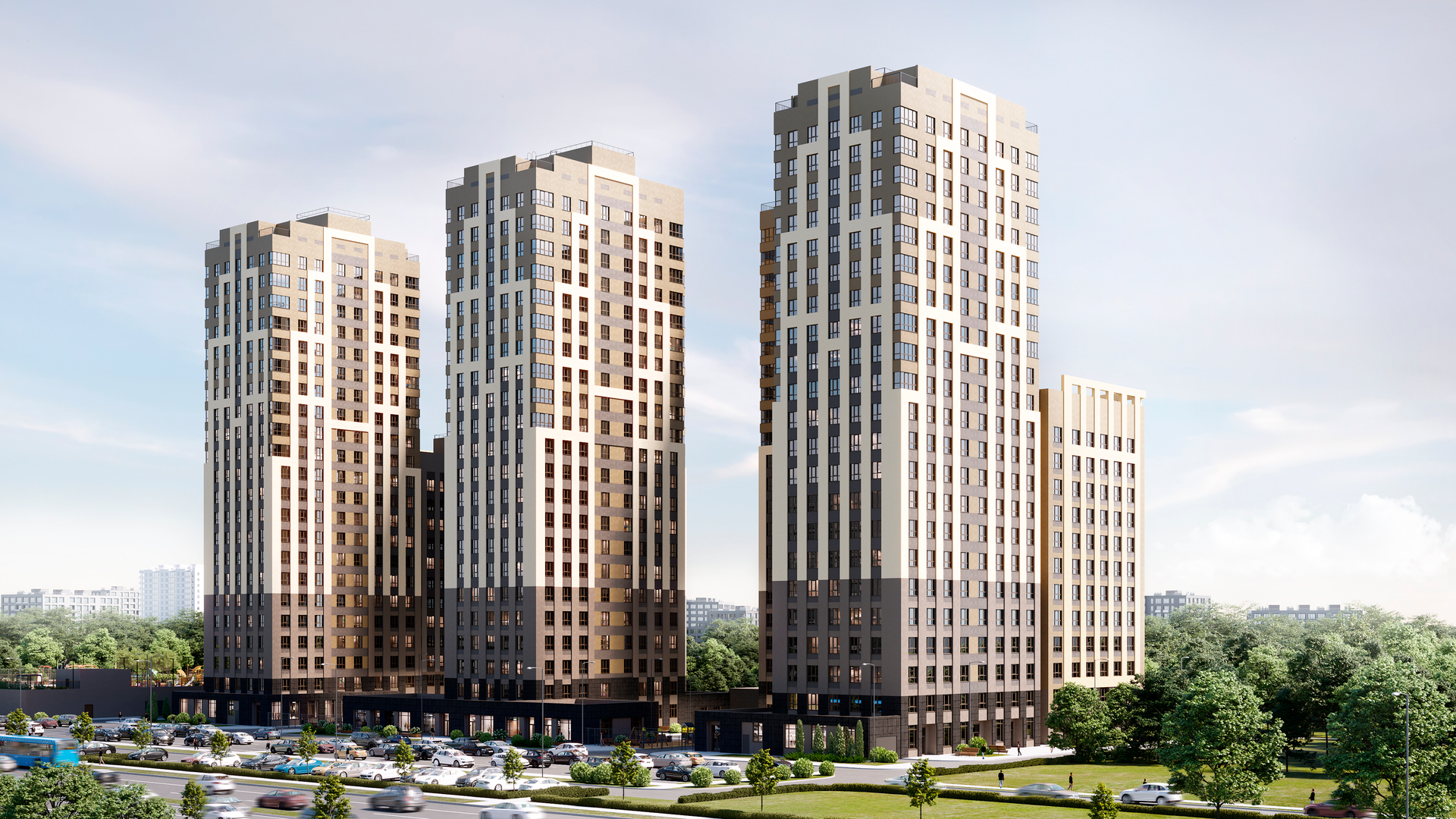 Концепция комплекса разработана в едином архитектурном образе — это закрытая дворовая территория с функциональным пространством между домами. Для детей разных возрастов разработаны безопасные детские площадки, на которых каждому найдется занятие по душе. На территории расположились также спортивные площадки для активного досуга. (изображение носит информационный характер)