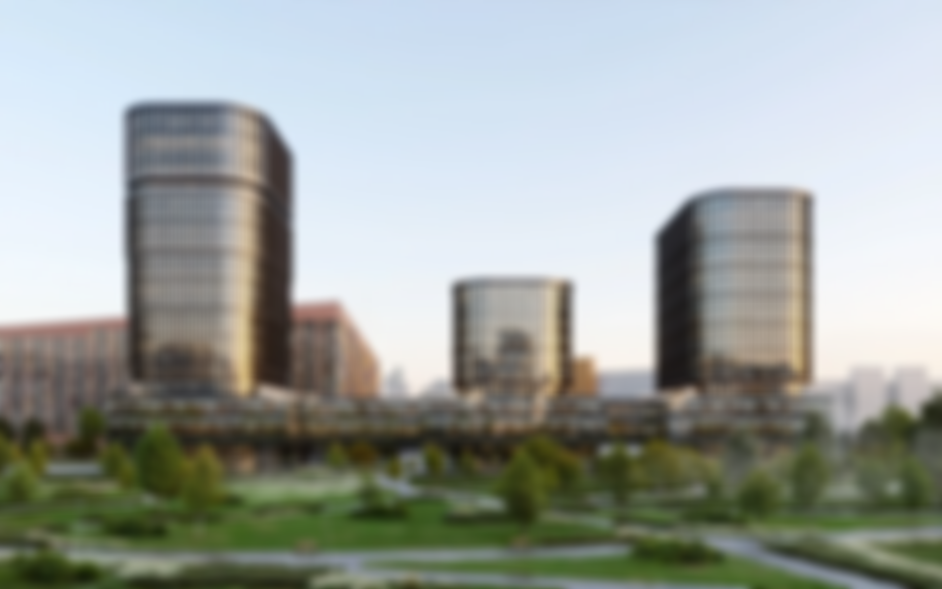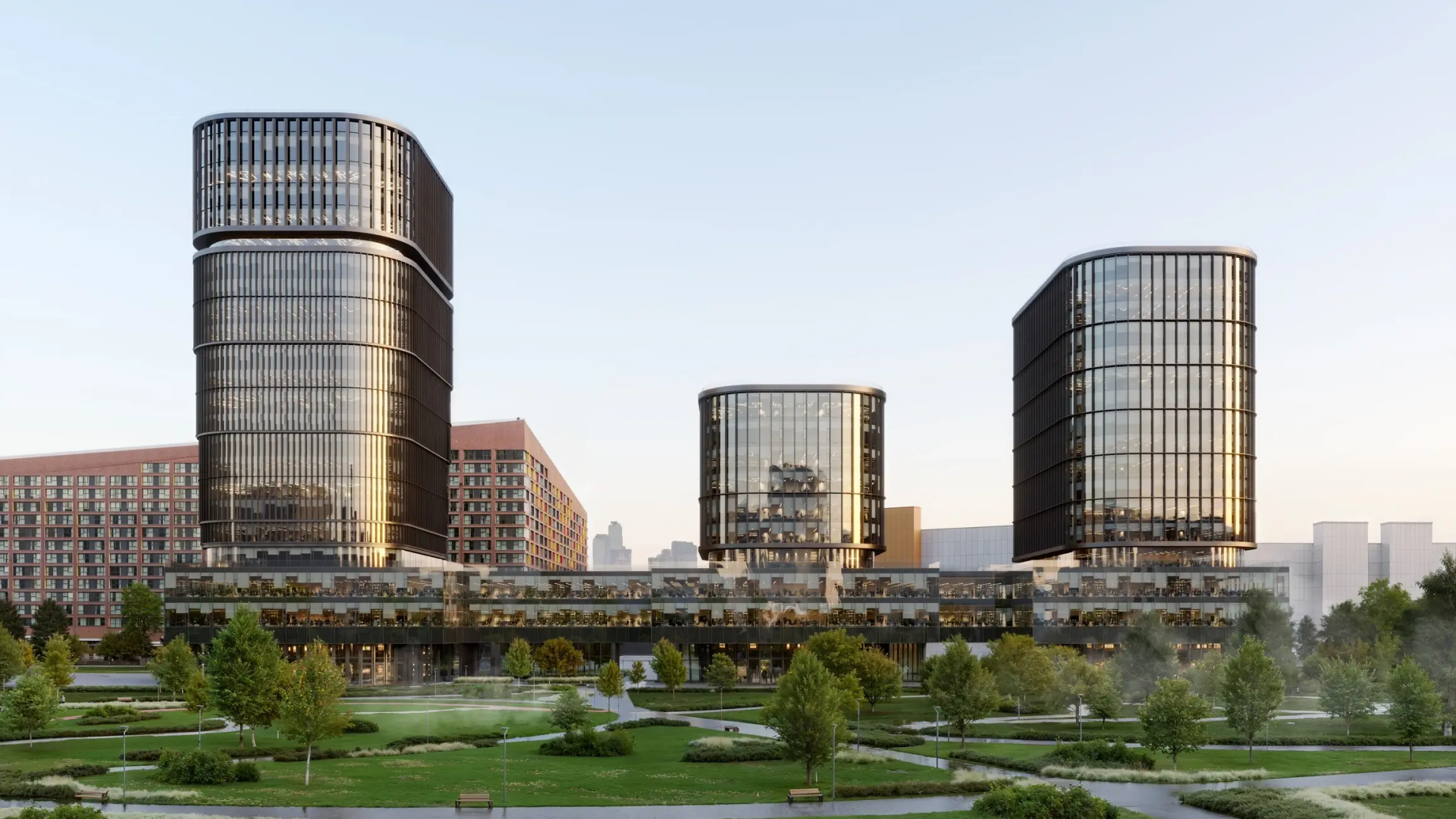 Проект включает в себя три офисные башни. Фасады зданий выполнены из прозрачного стекла и металла с динамичным рисунком из ламелей. Входные группы оформлены в современном стиле, что создает уютную и благоустроенную атмосферу.