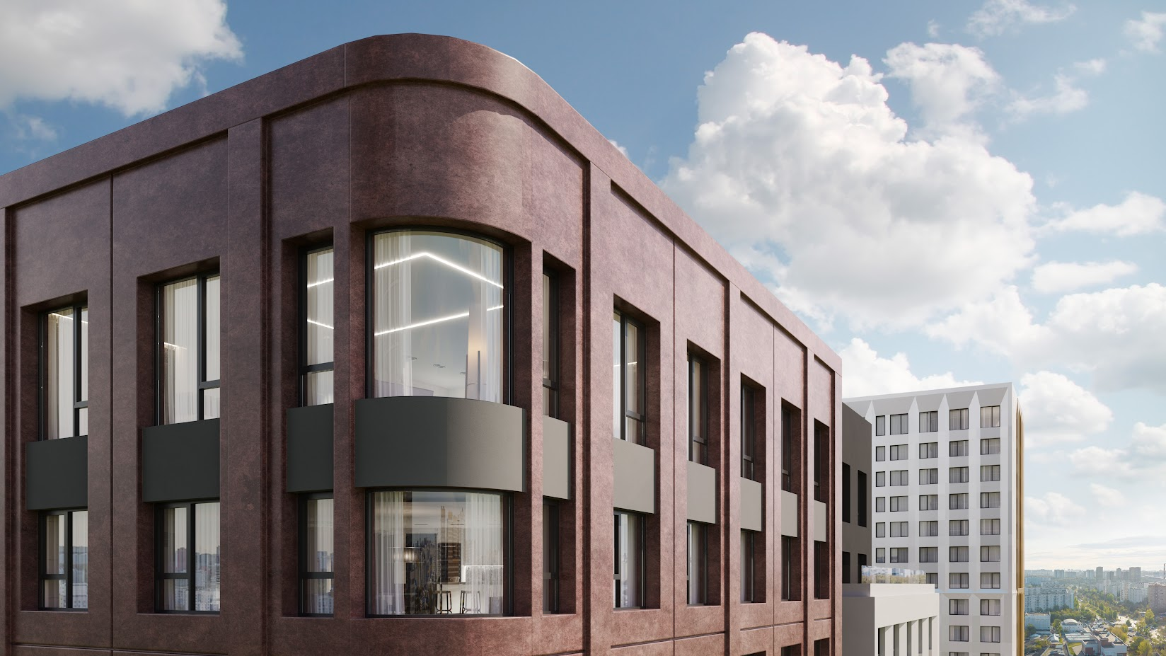 Проект состоит из замкнутых кварталов с домами высотой от 12 до 38 этажей. Каждый корпус будет выполнен в индивидуальной стилистике с оригинальными объёмными фасадами. Внешние стены будут облицованы качественными материалами в натуральной цветовой гамме. В темное время суток фасады будут украшены архитектурной подсветкой.