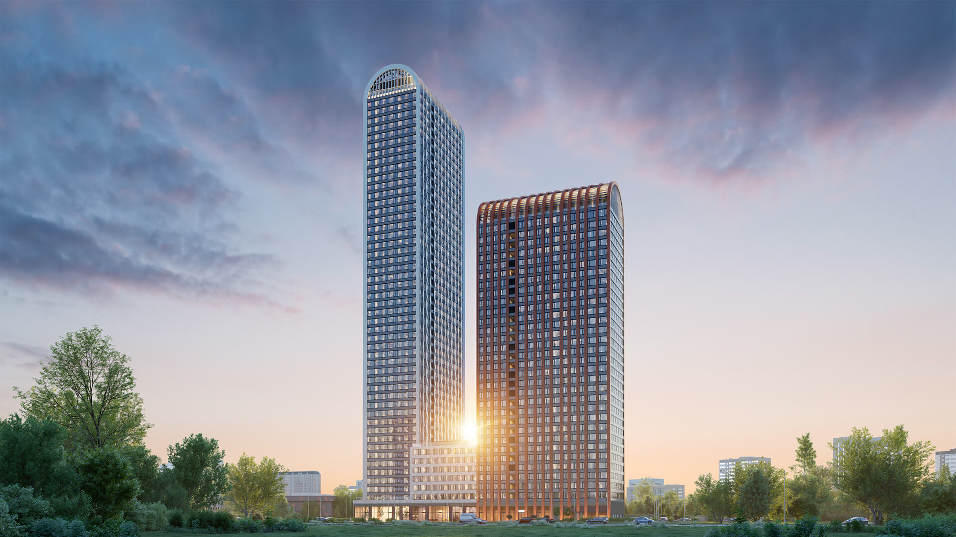 Проект включает две башни высотой от 33 до 40 этажей, объединенные стилобатом. Архитектурное оформление выполнено в современном стиле с элементами минимализма. Фасады зданий сочетают белые и бронзовые оттенки, создавая эффектный контраст. Геометрические декоративные элементы придают зданиям индивидуальность, а панорамные окна обеспечивают отличную инсоляцию и живописные виды на Москву.