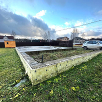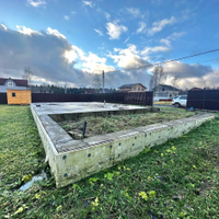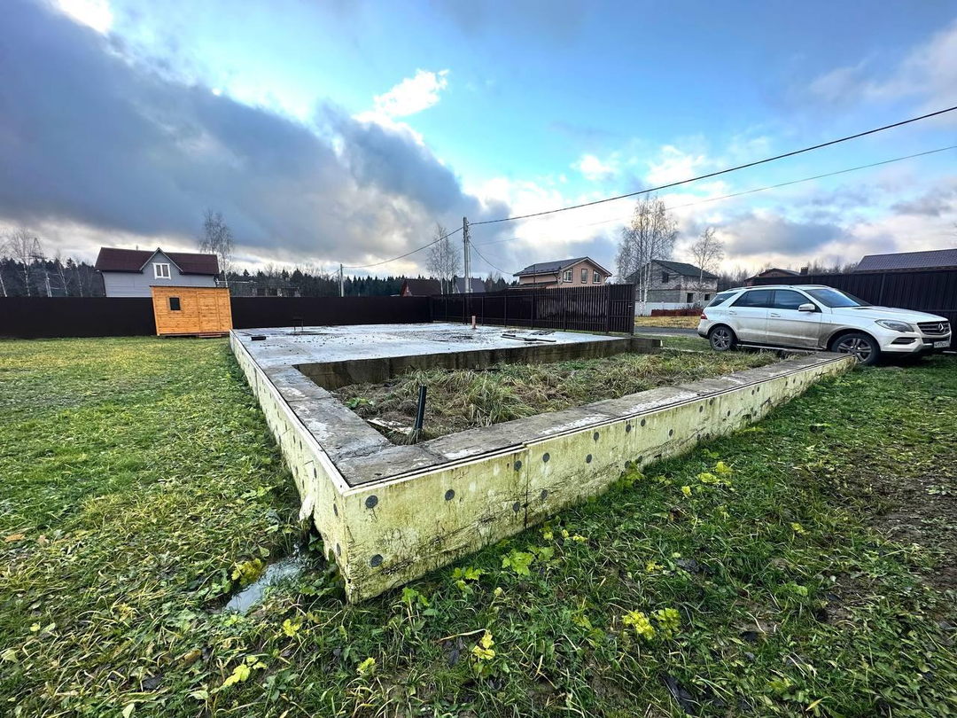 Фундамент отлит по технологии фахверк + плита . Он уже отстоялся , а это значит, не надо ждать и тратить денежные средства на его возведение . Просто завозите материал для стен и приступаете к стройке . Проект дома есть .